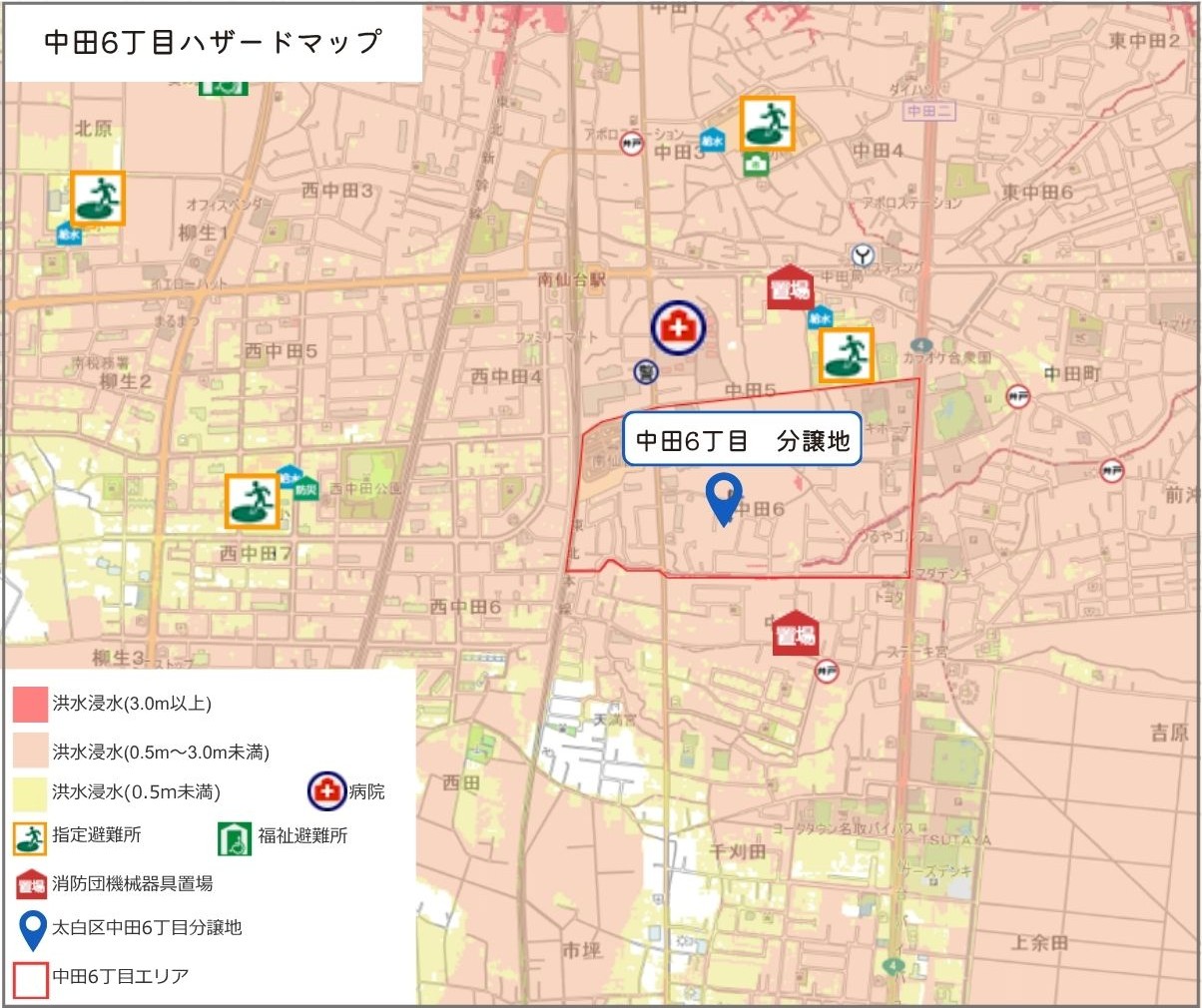 最新の洪水ハザードマップにおいて、中田6丁目の分譲地は「浸水想定区域(0.5m〜3.0m)」に該当していますが、これは中田エリアを含む太白区の平野部における広範囲に共通する特性です。